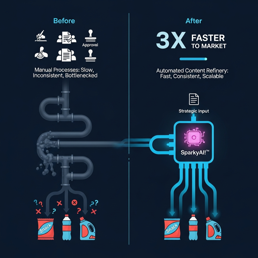 SparkyAI!™ automates repetitive content tasks and optimizes workflows, allowing CPG brands to produce high-quality content faster and more efficiently while maintaining brand consistency across all channels.
